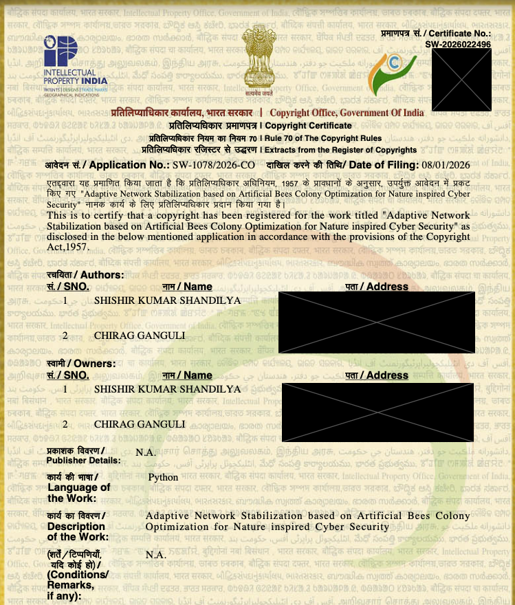 Copyright Office, Govt of India > Enhanced Artificial Bees Colonization Algorithm for Adaptive Nature-Inspired Cyber Defense